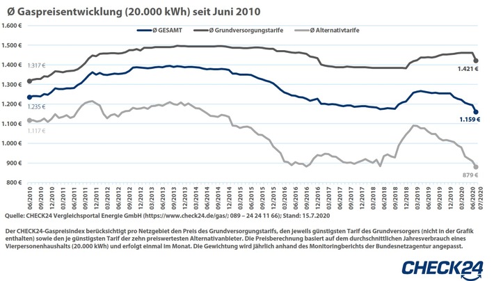 Ein Grund für das große Sparpotenzial: Die Preise der alternativen Gasanbieter (https://www.check24.de/gas/gasanbieter/) fallen seit Februar 2019 kontinuierlich. Im Juli 2020 kosteten 20.000 kWh im Schnitt der zehn günstigsten Alternativanbieter 879 Euro. Das ist der niedrigste Stand der vergangenen zehn Jahre.