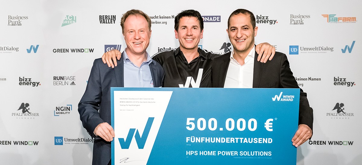 Am Donnerstag, den 18. Oktober, wurde im Rahmen der „Nacht der Engel“ in Berlin zum ersten Mal der WIWIN AWARD verliehen. Aus fast 80 Bewerbungen aus den Bereichen Erneuerbare Energien, Energieeffizienz, Elektromobilität, Nachhaltiges Bauen, Ökologische Landwirtschaft sowie Sozialunternehmen hat WIWIN in einem mehrstufigen Bewerbungsverfahren das beste deutsche Startup für Nachhaltigkeit prämiert. In einem Live-Pitch vor der 12-köpfigen Experten-Jury sowie vor mehr als 200 geladenen Gästen konnte sich das Berliner Startup Home Power Solutions (HPS) durchsetzen. HPS gewinnt damit ein Investment in Höhe von 500.000 Euro. Die ersten 100.000 Euro steuert Matthias Willenbacher, Initiator des WIWIN AWARDs, persönlich bei. Der Rest wird durch die Crowd finanziert.