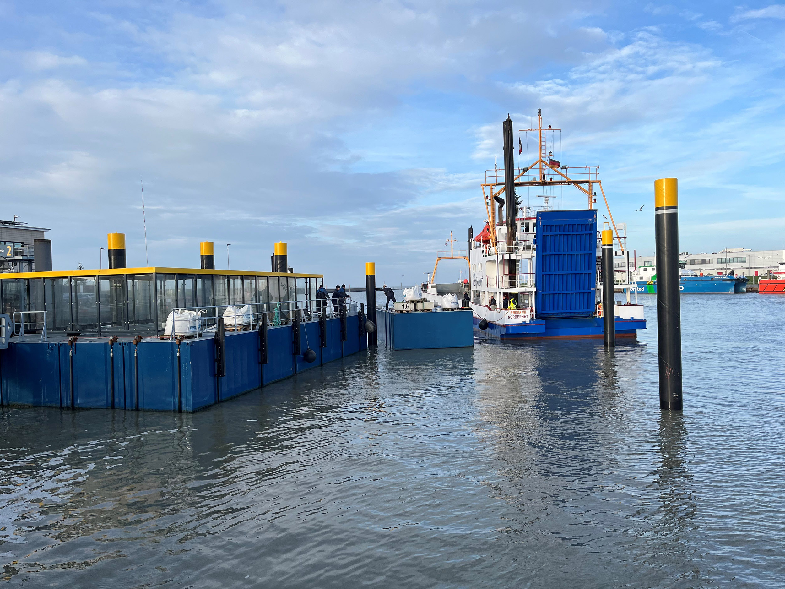 Damit ein Schiff regelmäßig elektrisch fahren kann, muss zunächst die Ladeinfrastruktur installiert werden. In Norddeich wurde nun (17. Dezember 2024) der Ladeponton für den neuen Elektrokatamaran (E-Kat) der AG Reederei Norden-Frisia per Schwerlast-LKW angeliefert und zu Wasser gelassen. Der Ladeponton übernimmt die Funktion einer „Wallbox“, wie für den Ladevorgang eines Elektroautos. Er ist der letzte Teil des Anlegers (Jetty) für den E-Kat, der aus insgesamt fünf Teilen besteht. Ab der Saison 2025 wird die innovative Fähre regelmäßig hier anlegen, mit regenerativ erzeugtem Strom geladen und bis zu achtmal täglich ohne CO?- Emissionen nach Norderney und zurück fahren.
