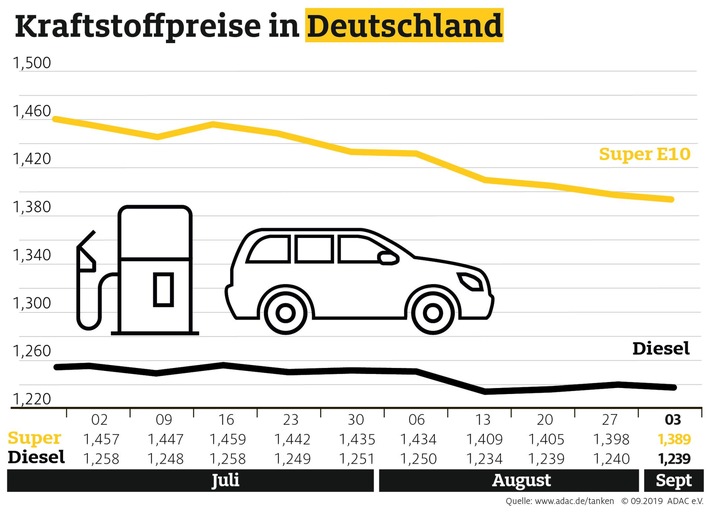 Auswertung des ADAC kostet ein Liter Super E10 im Bundesmittel 1,389