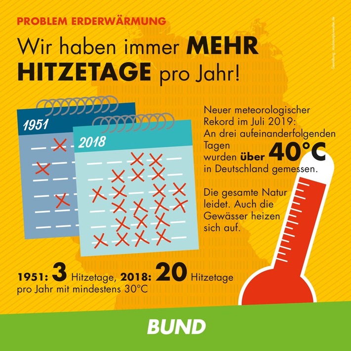 Die Temperaturentwicklung der vergangenen Jahre ist für die Natur dramatisch. Die Jahre 2014, 2018 und 2019 waren die drei wärmsten Jahre seit Beginn der Wetteraufzeichnung, darunter leiden Gewässer genauso wie Wälder, Tiere und auch die Landwirtschaft. Bandt: „Sinkende Grundwasserstände sowie steigende Wassertemperaturen haben fatale Folgen auf Mensch und Umwelt. Das Fischsterben im letzten Jahr wird nicht das letzte gewesen sein. Deshalb ist es zentral, der Klimakrise entschlossen zu begegnen. Die Bundesregierung muss alles tun, das selbstgesteckte Ziel, die Erderwärmung auf maximal 1,5 Grad zu begrenzen, zu erreichen.“ In Zeiten von Klimakrise und Artensterben müssen Flüsse und Bäche, Teiche und Seen, die Hitze und Trockenheit gut verkraften und es braucht Landschaften, die Wasser zwischenspeichern können. Dies gelingt aus Sicht des Naturschutzverbandes nur, wenn der Gewässerschutz in allen Politikbereichen mitgedacht wird. Mit Blick auf die Auswirkungen der industriellen Landwirtschaft auf Gewässer und die Landwirtschaftskommission fügt Bandt an: „Ich erwarte von Bundesagrarministerin Julia Klöckner, dass sie die Zukunft der Lebensmittelproduktion gestaltet und nicht schon wieder einen naturverträglichen Umbau der deutschen Landwirtschaft verhindert. Das gleiche gilt für Bundesminister Andreas Scheuer, der endlich die Flüsse nicht mehr als nasse Autobahnen betrachten darf, sondern deren Rolle für die Grundwassersicherung für uns alle auch aktiv unterstützen muss.“
