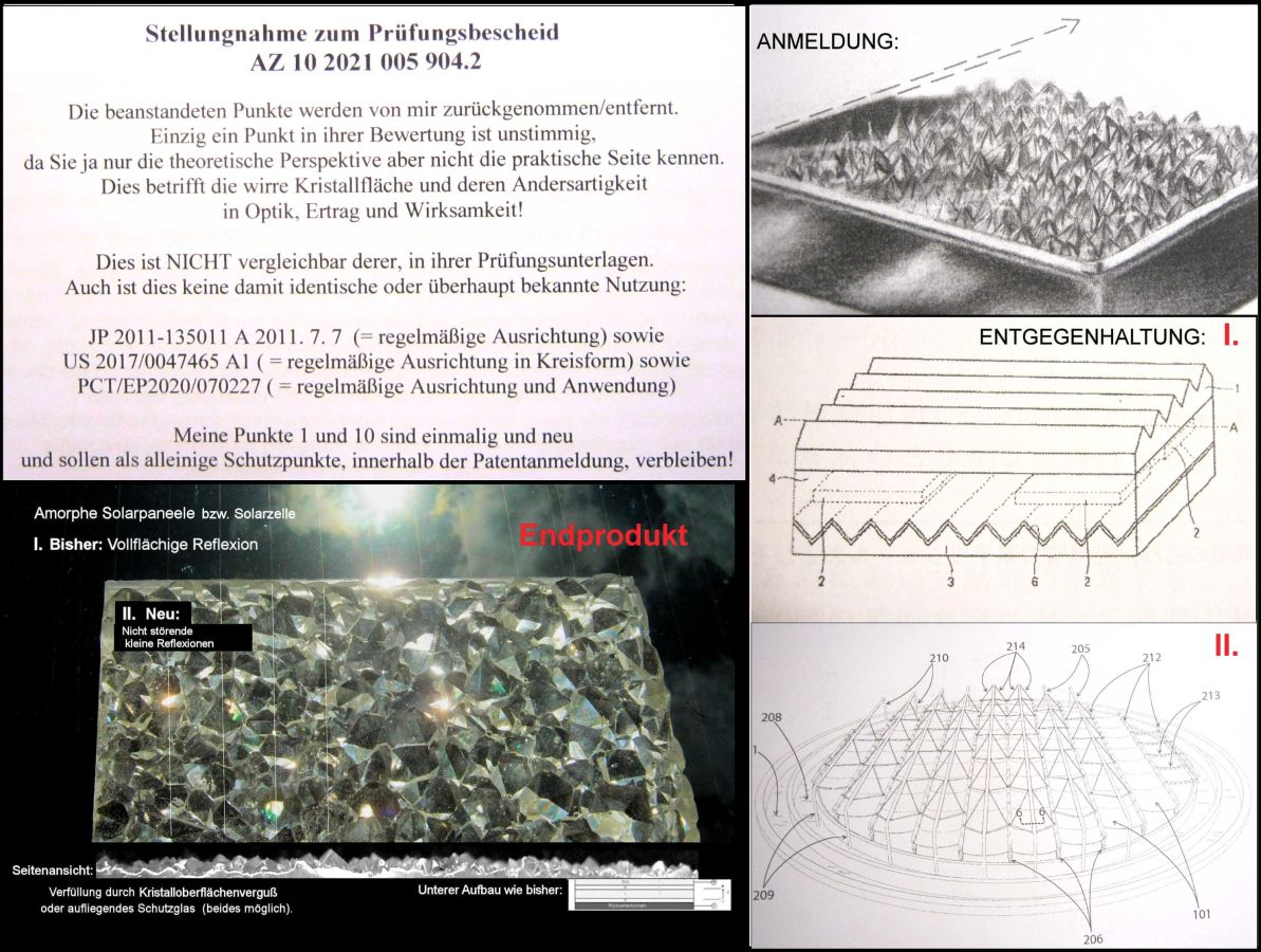 „Ihre Patentanmeldung mit dem Aktenzeichen 10 2021 005 904.2 mit der Bezeichnung ‚Solarmodul bzw. Solarpaneel mit größtmöglicher Oberfläche‘ befindet sich noch im Patentprüfungsverfahren. Das Patent wurde bisher nicht erteilt. Status: Anhängig/in Kraft.“