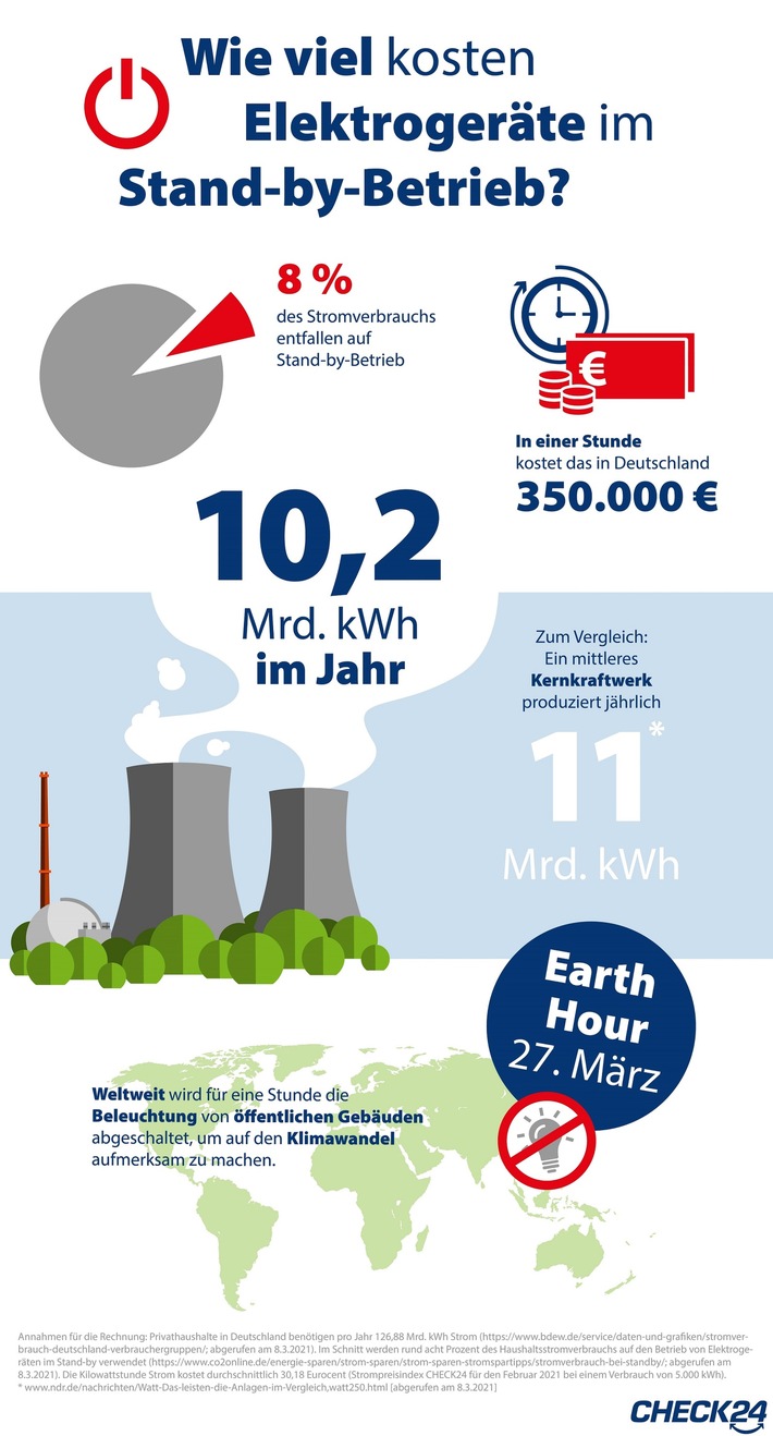 München (ots) – Elektrogeräte im Stand-by bringen wenig Nutzen, verursachen aber hohe Kosten. In jeder Stunde verbrauchen deutsche Privathaushalte rund 1,2 Millionen kWh für Elektronik im Ruhemodus. Das entspricht Stromkosten (https://www.check24.de/strom/stromkosten/) von circa 350.000 Euro pro Stunde.1)