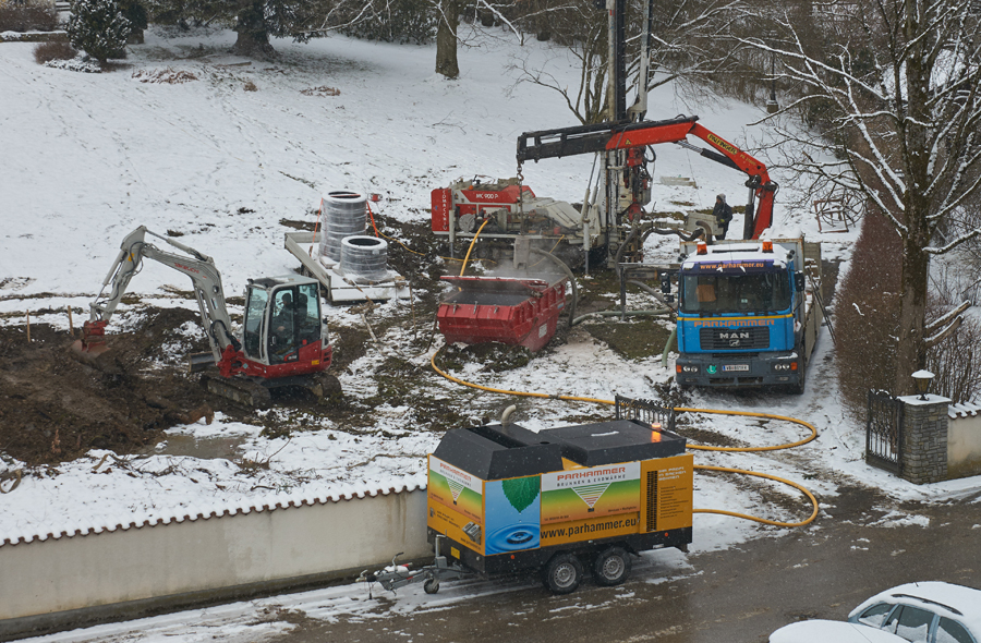 „Einen typischen Auftrag haben wir kürzlich in Mondsee abgewickelt“, berichtet Inhaber Matthias Parhammer. Für die Heizung einer Neubau-Wohnanlage mit 12 Einheiten wurde dort eine Erdwärmesonde auf 100 m Tiefe eingebaut. Oberflächennah steht dort, wie hier in der Region häufig, zunächst lehmiger Boden, in größerer Tiefe dann Sandstein an. „Damit wir überhaupt auf 100 Meter Bohrtiefe kommen können, brauchen wir Druckluft mit bis zu 24 bar Betriebsüberdruck bei einem Volumenstrom von 20 m³/min. „Nur ein geringer Teil der Druckluft bedient dabei den Bohrhammer, der andere Teil bläst das Bohrloch frei und fördert das Bohrklein an die Erdoberfläche“, erklärt Matthias Parhammer.
