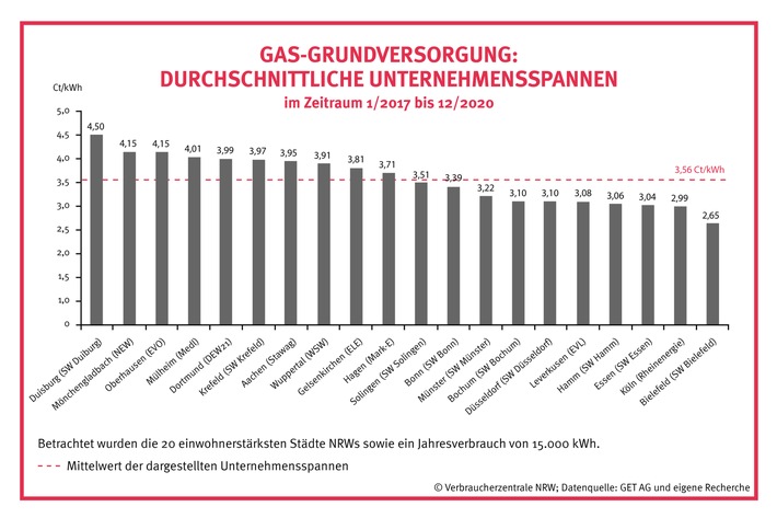 Einen Überblick über die Unternehmensspannen der Gas-Grundversorger in den 20 einwohnerstärksten Städten NRWs seit dem Jahr 2017 gibt es unter http://www.verbraucherzentrale.nrw/gaspreise2020