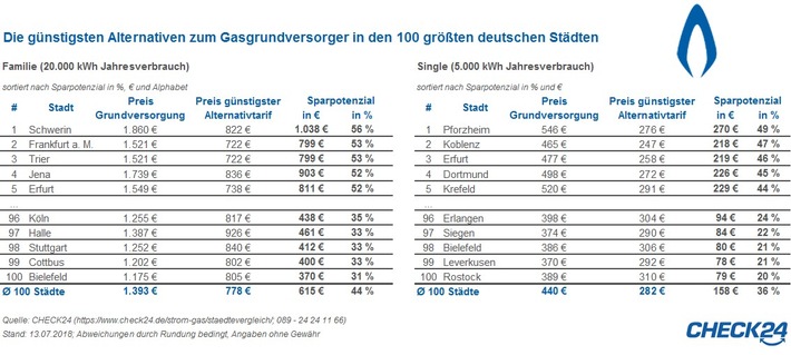 Im Schnitt der 100 Städte sparen Singles mit einem Jahresverbrauch