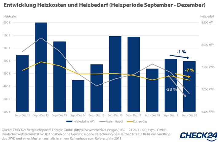 Eine Musterfamilie, die ihr Reihenhaus mit Gas heizt, zahlte dafür von September bis Dezember 2020 insgesamt 449 Euro. Eine Familie mit Ölheizung zahlte in diesem Zeitraum 341 Euro. Mit Öl heizen Verbraucher in der aktuellen Heizperiode also knapp 24 Prozent günstiger als mit Gas.