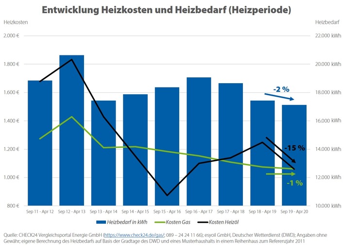 – Heizbedarf von September 2019 bis April 2020 etwa auf Vorjahresniveau – Heizen mit Öl in der aktuellen Heizperiode 15 Prozent günstiger als im Vorjahr – Alternativtarife aktuell 36 Prozent günstiger als Gasgrundversorgung