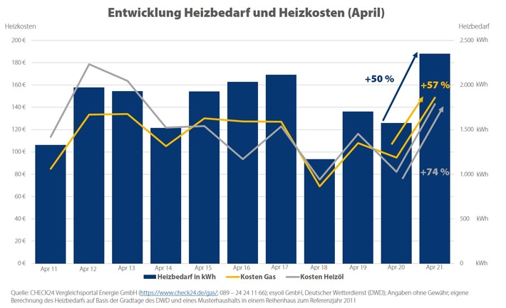 München (ots) – Der April 2021 war so kalt wie in den vergangen 40 Jahren nicht.1) Daher mussten Verbraucher*innen 50 Prozent mehr Energie für das Heizen aufwenden als im Vorjahresmonat. Ein Haushalt mit Gasheizung zahlte im April 2021 54 Euro mehr als im Vorjahr.2;3) Ein Musterhaushalt mit Ölheizung musste sogar 61 Euro mehr für das Heizen zahlen als noch im April 2020.