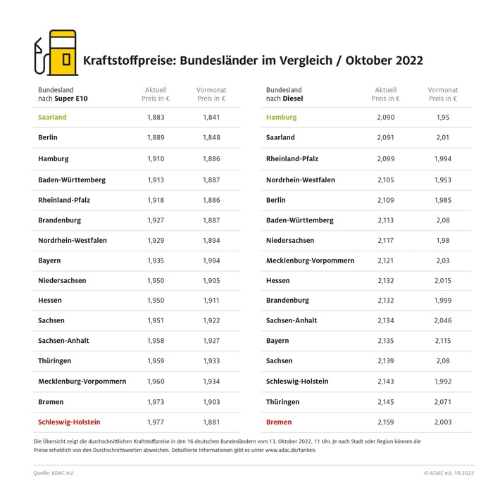 Der letzte Preissprung setzt ganz Deutschland zu, doch aktuell müssen Autofahrerinnen und Autofahrer in großen Teilen von Norddeutschland beim Tanken am tiefsten in die Tasche greifen. So werden laut heutiger ADAC Auswertung der Kraftstoffpreise in den 16 Bundeländern in Bremen 2,159 Euro für einen Liter Diesel fällig. Super E10 ist in Schleswig-Holstein mit 1,977 Euro pro Liter am teuersten. Insgesamt ist das Tanken im Saarland derzeit am günstigsten: E10 gibt es hier für 1,883 Euro je Liter, Diesel kostet im Schnitt 2,091. Hier ist nur Hamburg mit 2,090 Euro einen Hauch billiger.