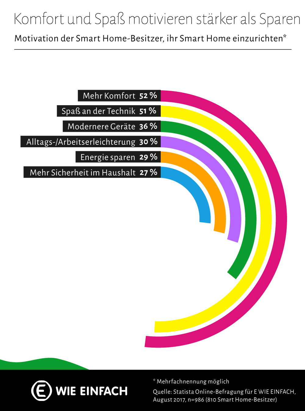 (Köln) Das Licht geht langsam mit dem Klingeln des Weckers am Morgen an, im Bad läuft schon die Lieblingsmusik und in der Küche wartet frisch aufgebrühter Kaffee. Mit Smart Home-Geräten sind das keine Komfortträume der Zukunft mehr, sondern längst Realität. Kein Wunder, dass der Komfort noch vor Energiesparen oder mehr Sicherheit für die meisten Deutschen der Hauptgrund für die Anschaffung ihres Smart Homes war. Das ergab eine Online-Befragung von Statista im Auftrag des Energie- und Smart Living-Anbieters E WIE EINFACH.