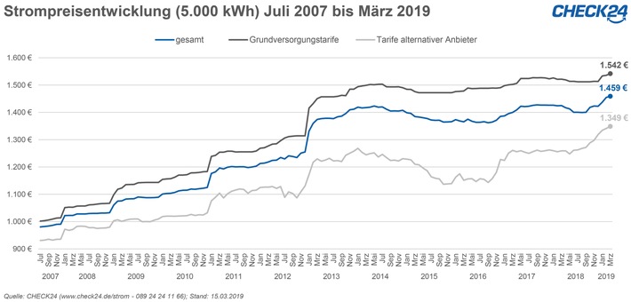 Der durchschnittliche Strompreis ist im März 2019 den siebten