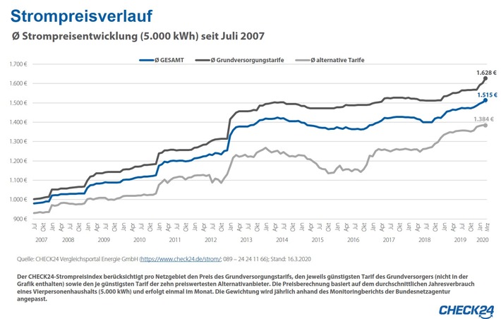 Der durchschnittliche Strompreis (https://www.check24.de/strom/strompreise/) ist im März erneut gestiegen und verharrt auf Rekordniveau. Verbraucher zahlen für 5.000 kWh im Schnitt 1.515 Euro. Das sind 56 Euro mehr als im Vorjahresmonat.
