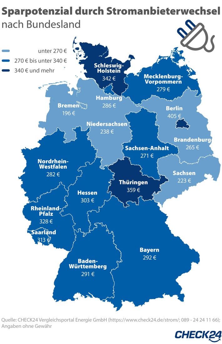 München (ots) – Familien aus Berlin sparen am meisten, wenn sie aus der Stromgrundversorgung zu einem der günstigsten Alternativanbieter wechseln. Innerhalb eines Jahres zahlt ein Musterhaushalt mit 5.000 kWh Stromverbrauch (https://www.check24.de/strom/stromverbrauch/) durchschnittlich 405 Euro weniger. Auch in Thüringen (Ø 359 Euro) und Schleswig-Holstein (Ø 342 Euro) ist das Sparpotenzial vergleichsweise hoch.
