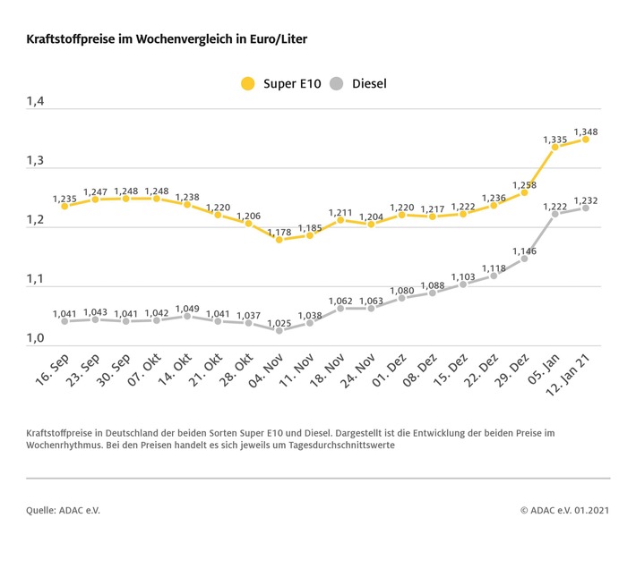 Nach dem kräftigen Preissprung zum Jahresbeginn ist Tanken in Deutschland binnen Wochenfrist erneut teurer geworden. Für einen Liter Super E10 müssen die Autofahrer derzeit im bundesweiten Mittel 1,348 Euro bezahlen, das sind 1,3 Cent mehr als vor einer Woche. Diesel verteuerte sich um einen Cent und kostet im Schnitt 1,232 Euro. Dies zeigt die aktuelle ADAC Auswertung der Kraftstoffpreise.