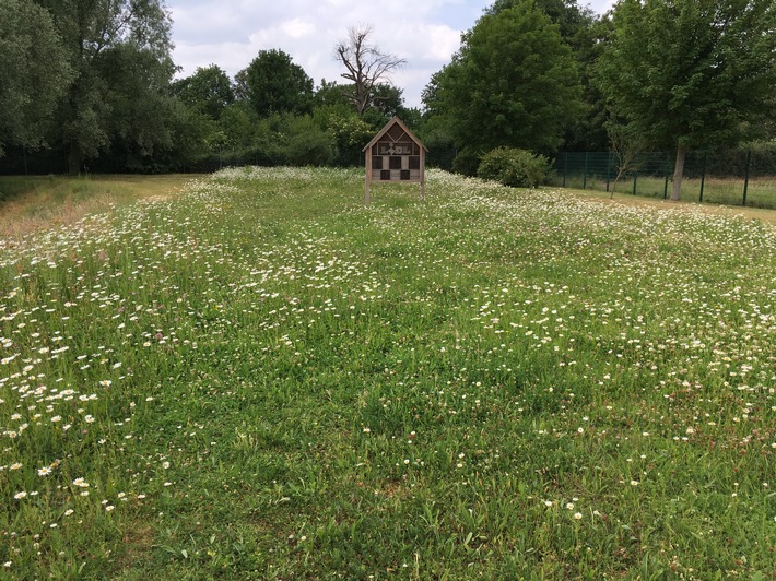 Verschiedene Wildbienen, darunter auch Hummelarten, sowie dicht besiedelte Insektenhotels – die Blühwiesen an den Lidl-Logistikzentren tragen…