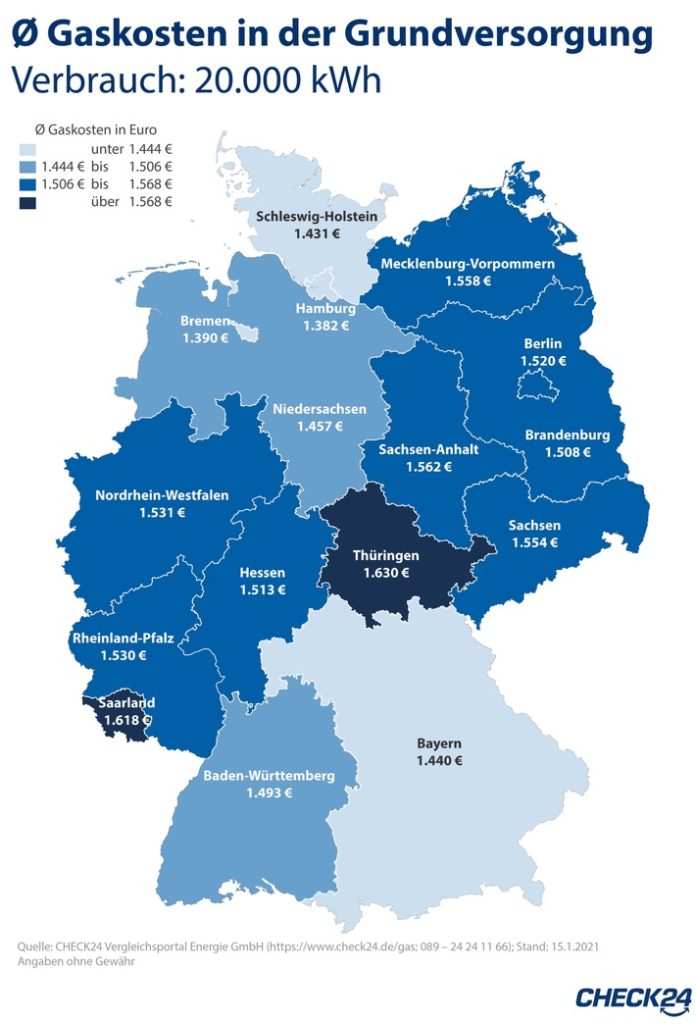 – 20.000 kWh Gas kosten in Thüringen in der Grundversorgung 1.630 Euro – Im Bundesdurchschnitt kosten…