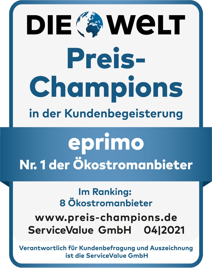 eprimo erneut „Preis-Champion“ beiÖkostrom und Ökogas / eprimo ist auch 2021 die Nummer 1 der bundesweiten Ökostromanbieter – 1 Million Kundenurteile zu 3000 Unternehmen aus 270 Branchen ausgewertet (FOTO)