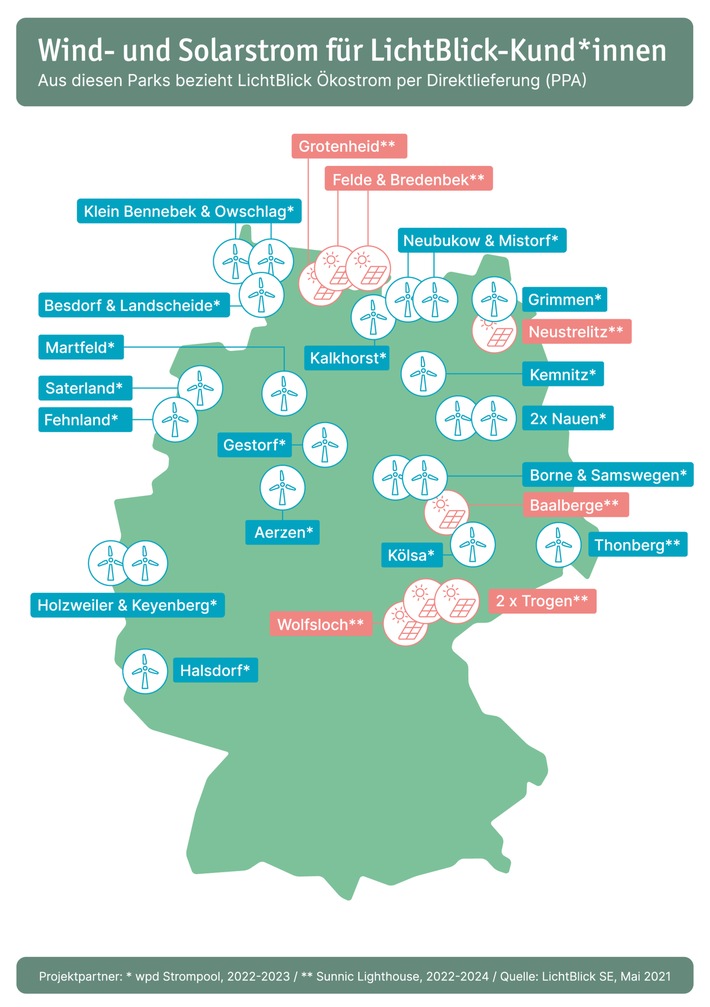 Deutscher Wind- und Solarstrom für LichtBlick-Kund*innen / Direktlieferung (PPA) aus 23 Wind- und acht Solarparks / Ökostrom ohne Subventionen (FOTO)