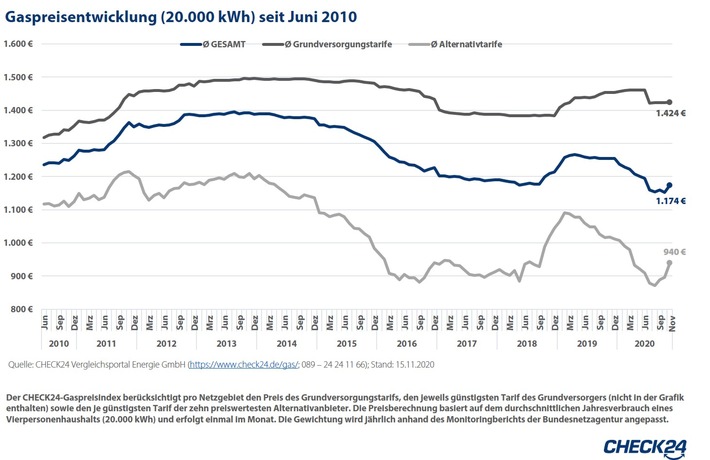Beim Gaspreis (https://www.check24.de/gas/gaspreise/) ist die Preisdifferenz zwischen Grundversorgung (https://www.check24.de/strom-gas/grundversorgung-ersatzversorgung/) und Alternativanbietern besonders groß. Für 20.000 kWh Gas zahlten Verbraucher im November 1.424 Euro. In den Alternativtarifen werden für die gleiche Menge Gas im Durchschnitt nur 940 Euro fällig (-34 Prozent).
