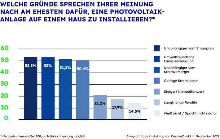 Die Vorstellung einer eigenen Photovoltaikanlage auf dem Haus kann durchaus verlockend sein: einfallendes Sonnenlicht, das durch Solarzellen direkt in „grünen“ Strom umgewandelt wird. Die Argumente, die für die Anschaffung einer Photovoltaikanlage sprechen, sind vielfältig. Eine große Rolle spielt die Nachhaltigkeit. Für 53 Prozent der Menschen in Deutschland ist die umweltfreundliche Energieerzeugung ein Grund für die Installation einer PV-Anlage auf einem Haus. Das ergab eine aktuelle Civey-Umfrage[1] im Auftrag von CosmosDirekt, dem Direktversicherer der Generali in Deutschland.